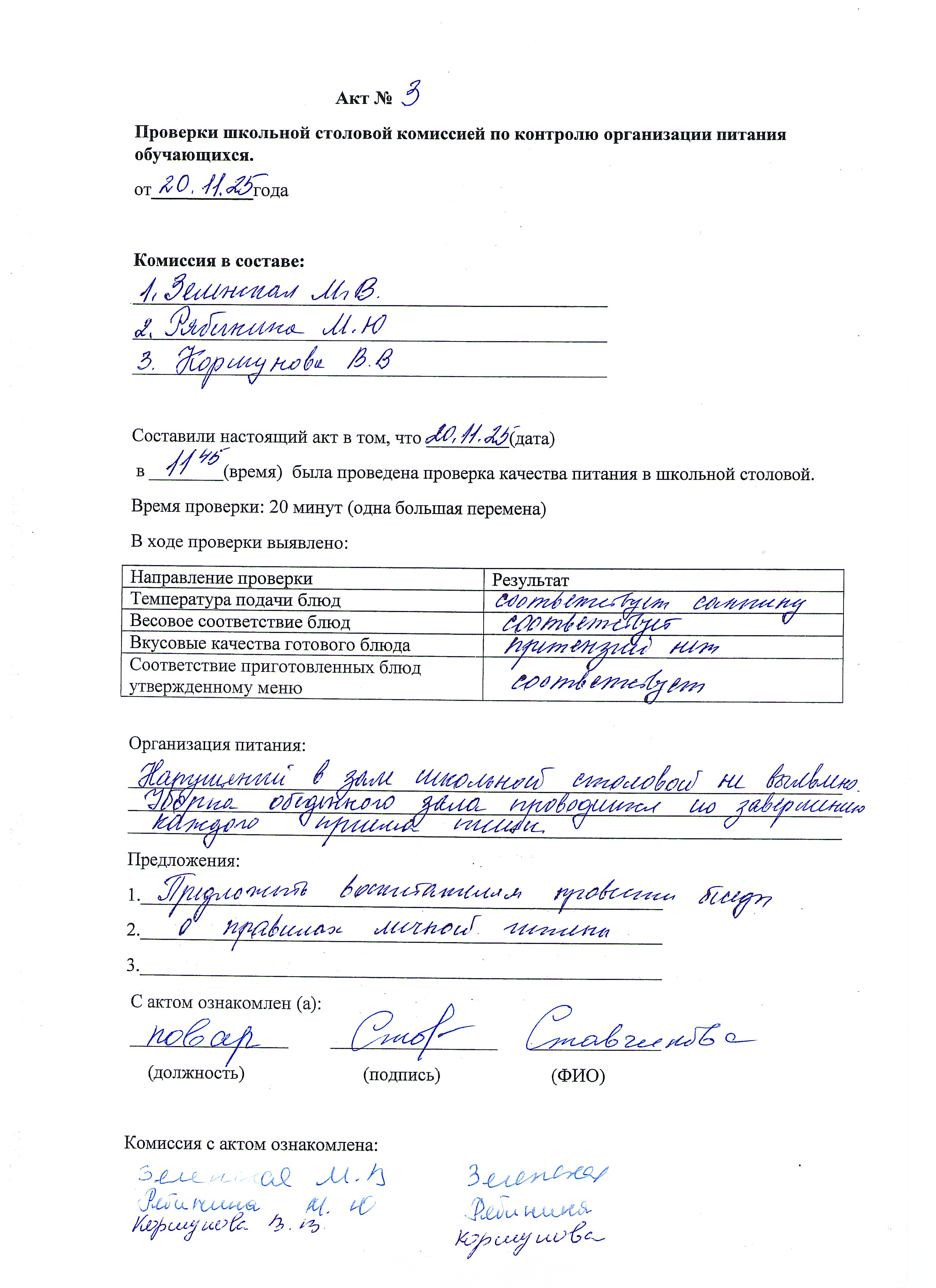 23 января 2025 года родительским контролем в составе членов: Зеленской М.В., Грибченко Т.И. и Рябининой М.Ю. была проведена проверка организации питания в школьной столовой.